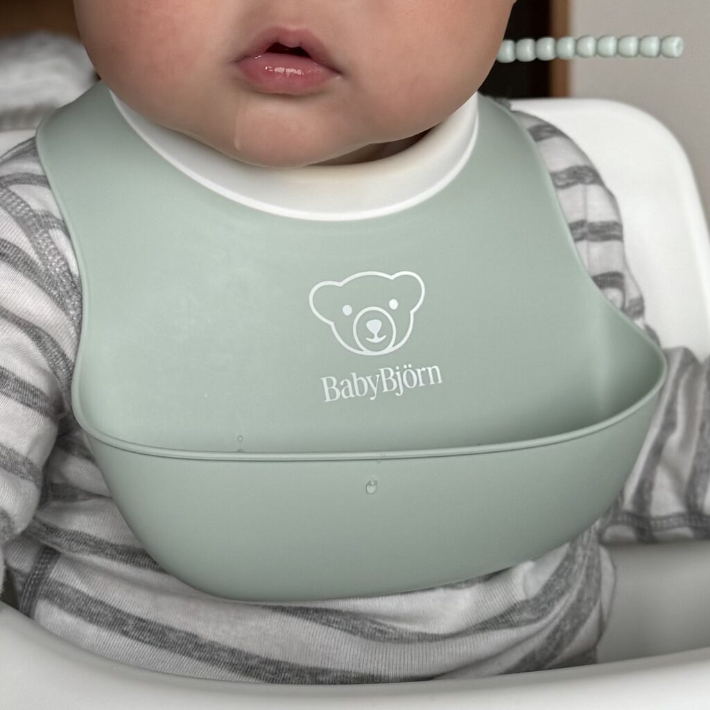 最初はやわらかいシリコンエプロンを使っていましたが、だんだん握ったり噛んだりして遊ぶように。