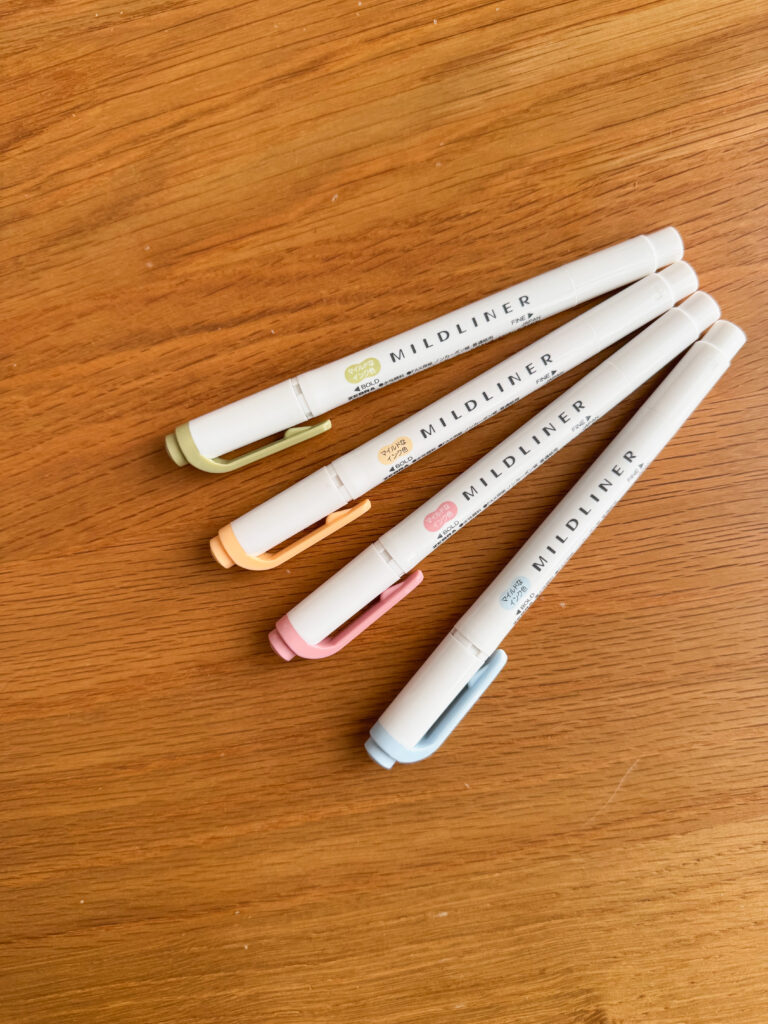 ゼブラのマイルドライナーは淡い色なので、文字が見えやすいまま色分けできて便利です。